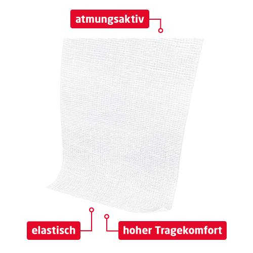 - Die Binde bleibt auch an viel bewegten Körperteilen haften und fixiert die Kompresse/Wundauflage.