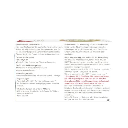 Die Einnahme von H&S® Thymian bei Kindern unter 12 Jahren wird nicht empfohlen. In der Originalpackung aufbewahren, um den Inhalt vor Licht und Feuchtigkeit zu schützen. Nicht über 25°C aufbewahren. Arzneimittel - Für Kinder unzugänglich aufbewahren.